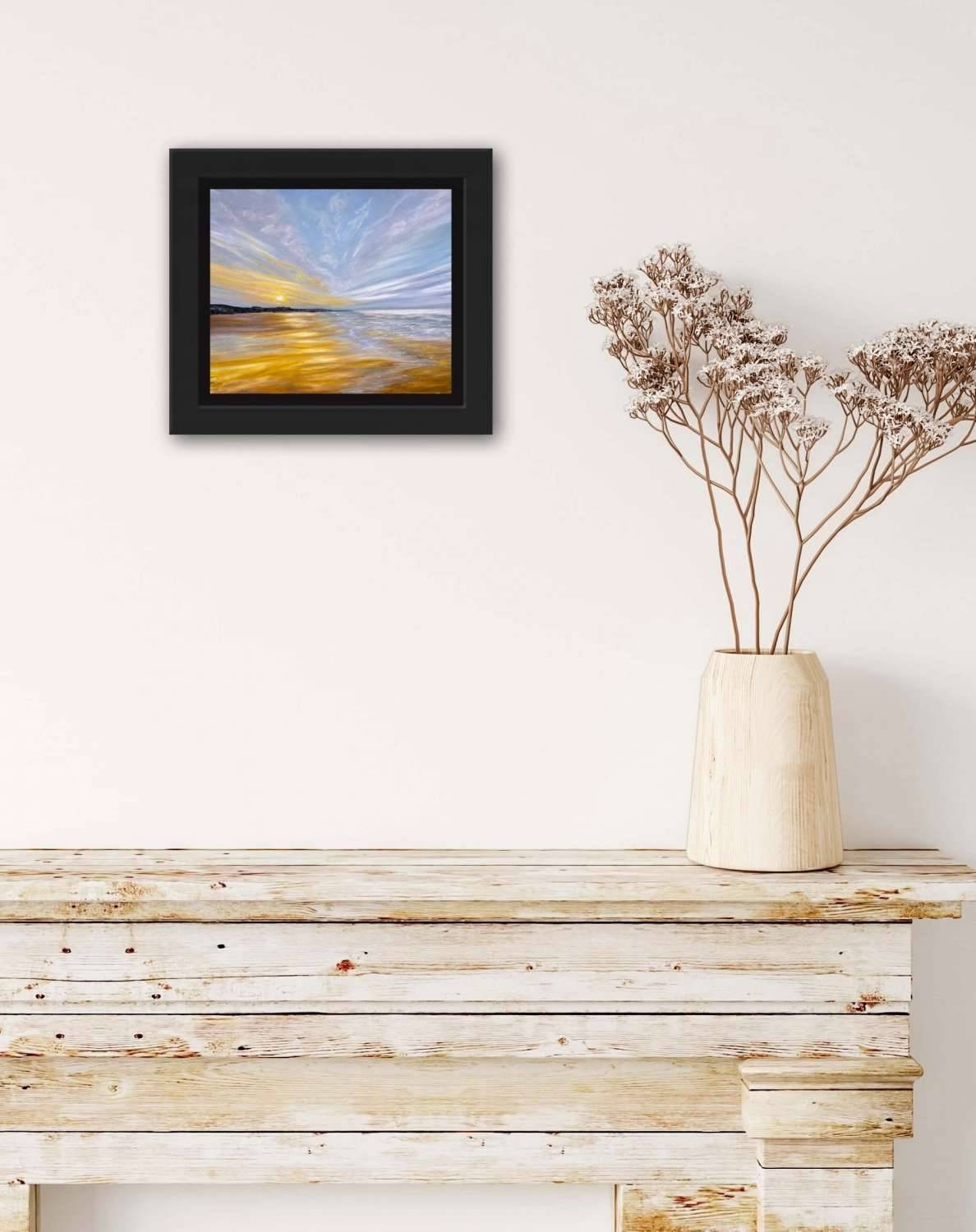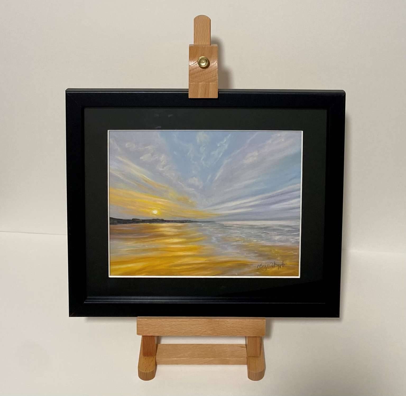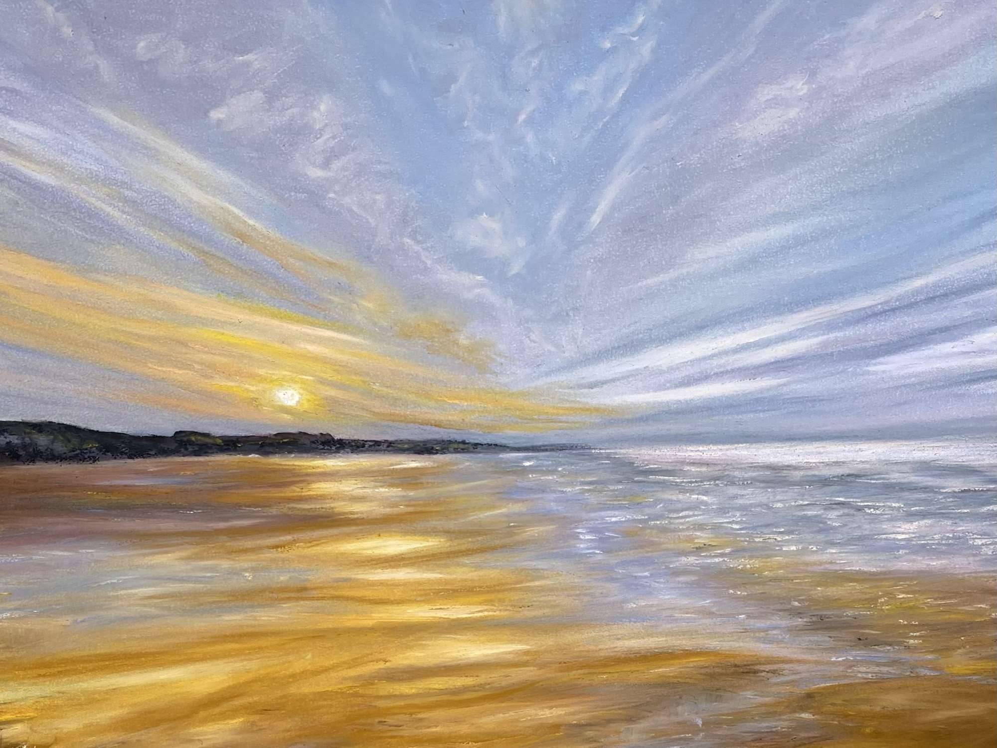Glorious Bamburgh Beach, with rays of golden light flowing across the sand. Signed original painting