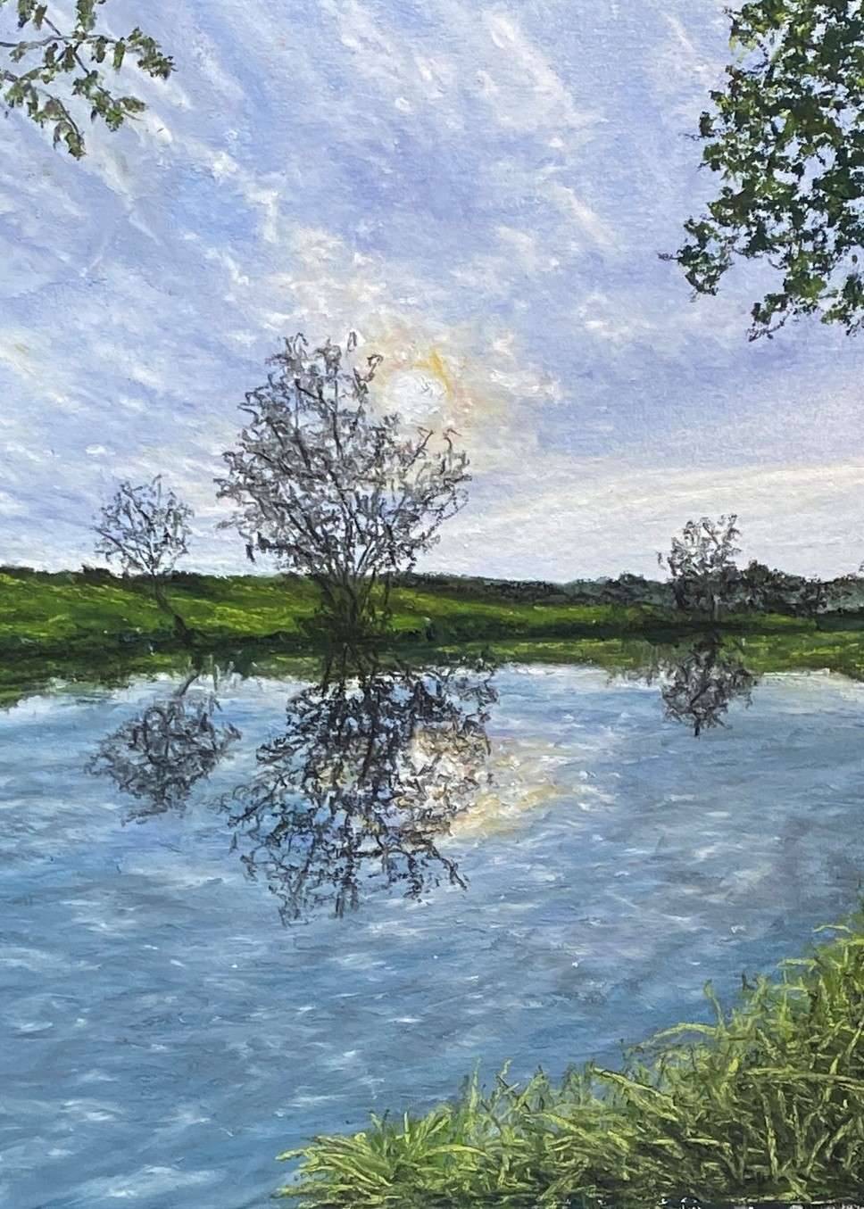 Blue sky with blustery clouds, haloed sun and reflections in water. I love walking on the canal and watching the sun play on the water.