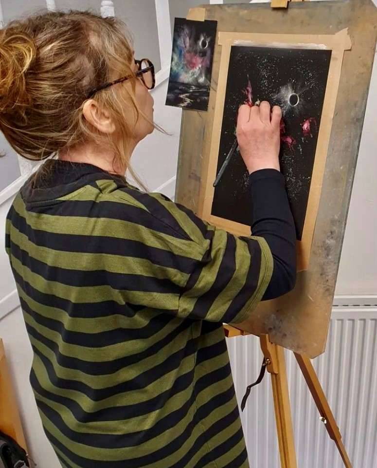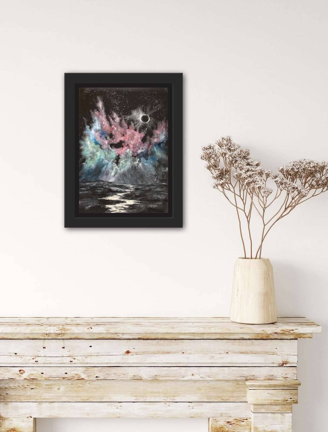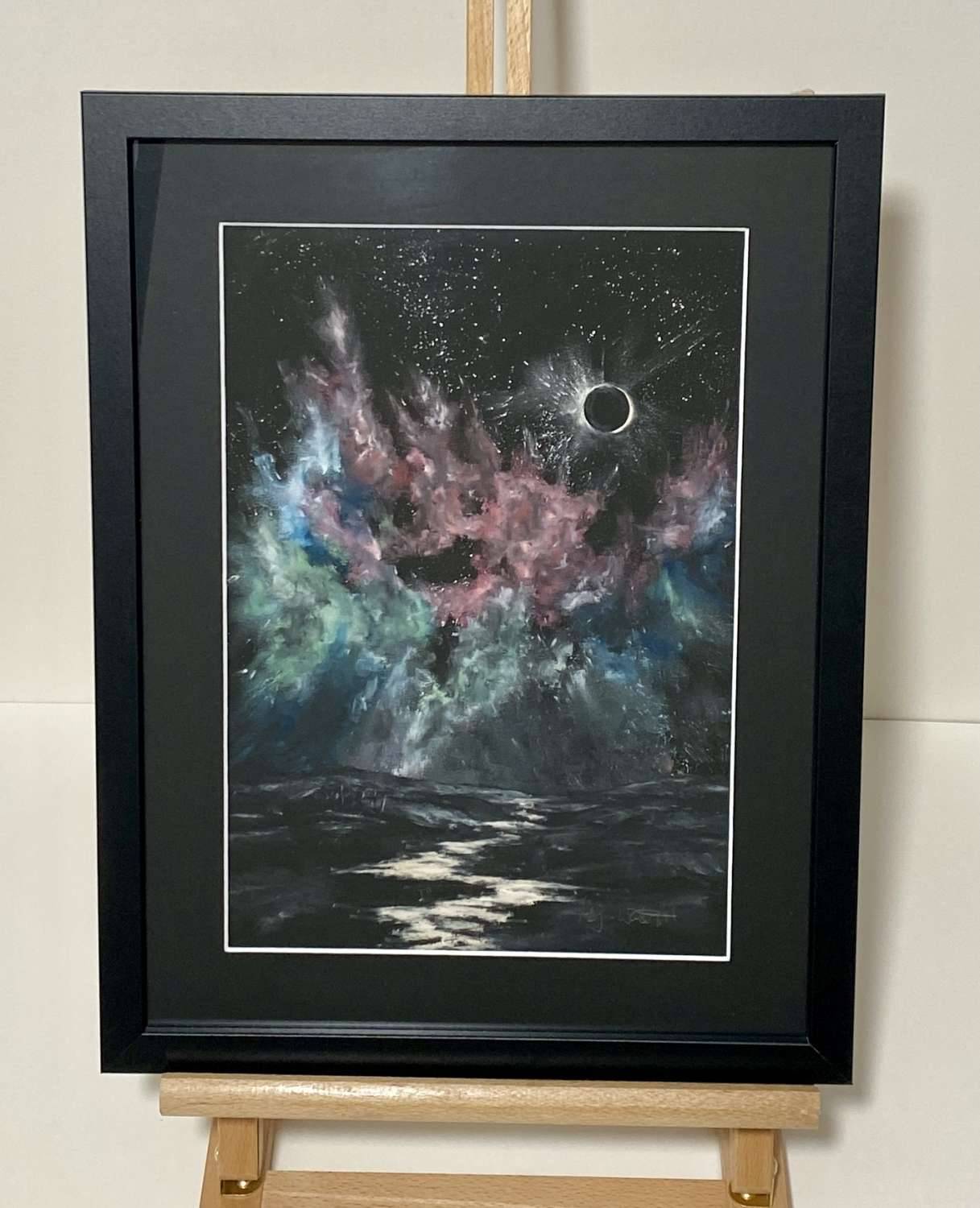 Original Moon Painting. I painted this as a demonstration piece at Craven Arts House. It is inspired by the Northern lights over North Yorkshire in March 2023. I painted a small study first which you can see in the corner of the demonstration photograph.