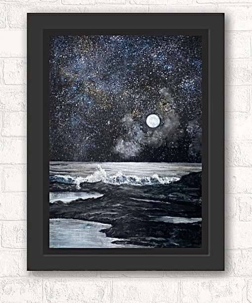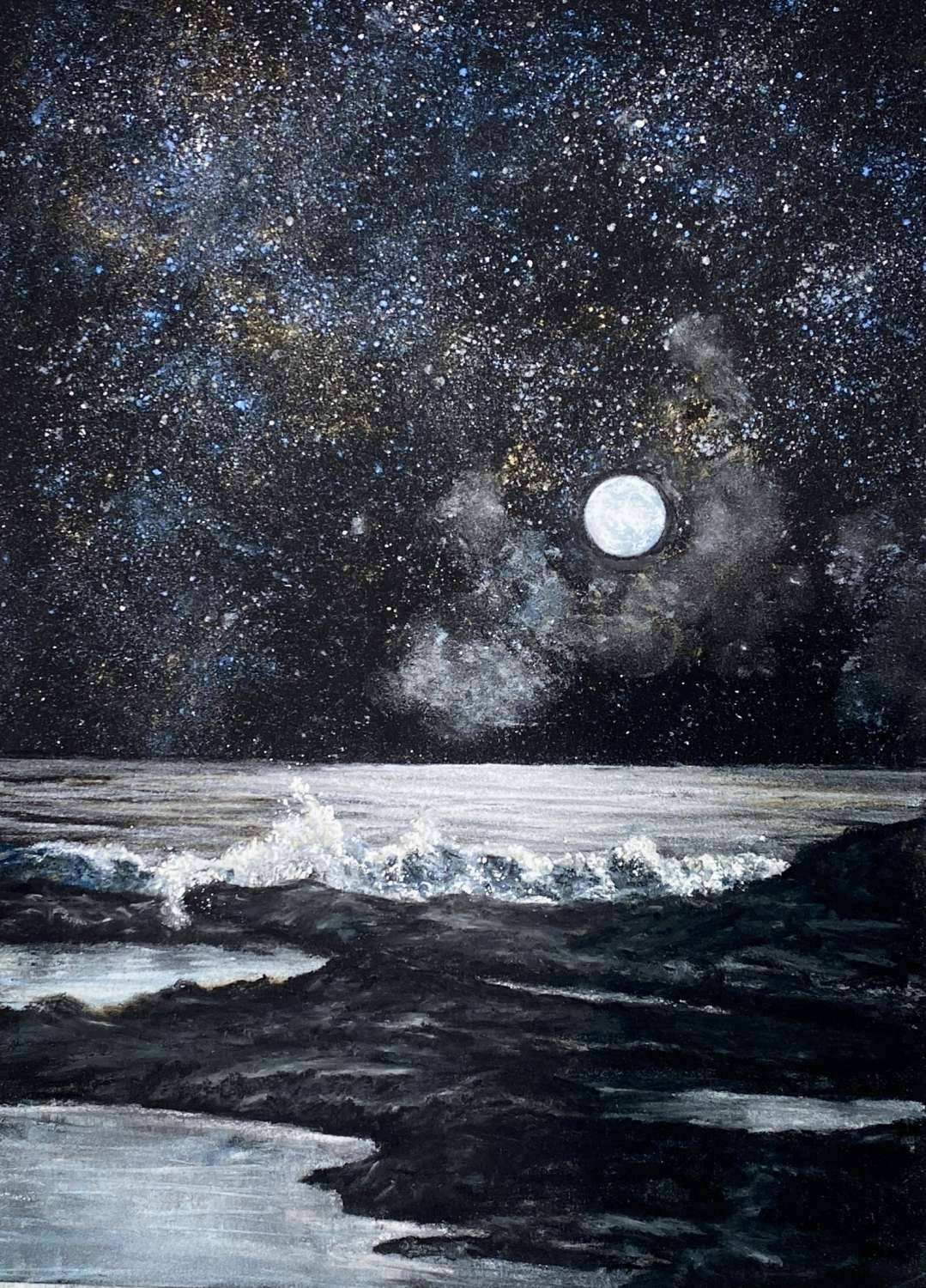 Two of my greatest loves, the sea and the moon. The moon set in the sparking silver, blue and gold sky. The tide ebbing and flowing, calling for you to float in the pools of light.